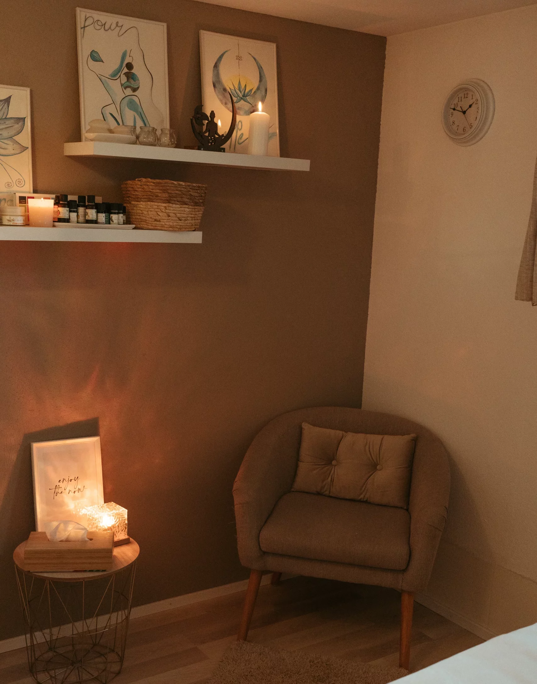 Désormais je vous accueille dans mon cabinet de massothérapie, à ambiance chaleureuse, pour prendre soin de vous, de votre corps et de votre esprit. Tous mes soins sont personnalisés à la demande, avec des huiles essentielles à choix ainsi qu’une huile de massage faite maison, bio et neutre.